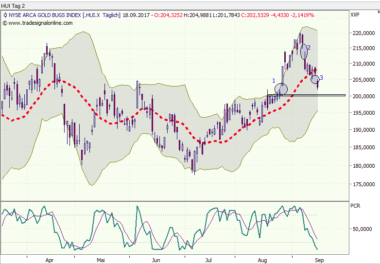 Drei Gaps beim HUI. Die Region um 200 ist eine wichtige Unterstützung (Mittleres Bollinger Band im Monatschart).
