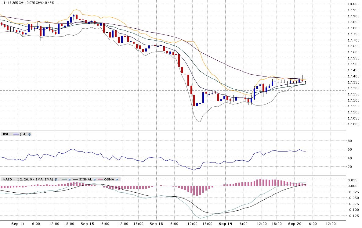 Chart 1 Silver hourly: Der 9 MA im Stundenchart wurde gestern nach unzähligen Versuchen nach oben durchbrochen. Die gleiche Kerze packte auch noch den 20 MA. Seither bieten 9 und 20 MA bei jeder Kerze Unterstützung, und der 50 MA ist nun Widerstand.