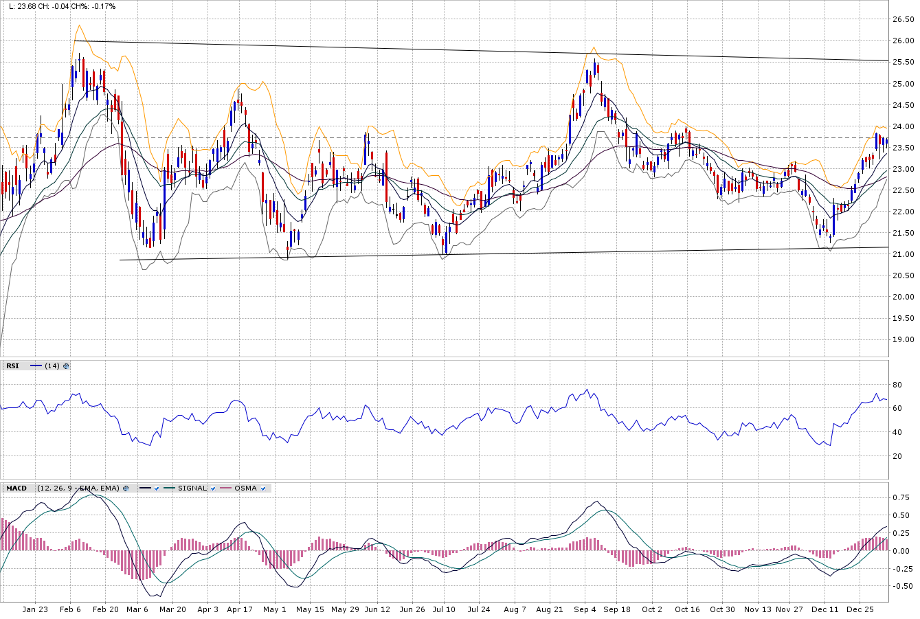 Ähnlich die Situation bei Goldaktien, hier Chart 2 GDX. Auch hier sind die MA's richtig angeordnet, der 9 MA ist nun zur Stelle. Halbwegs ähnliche Situationen (Anordnung der MA's schön der Reihe nach und nach oben gerichtet) gab es Anfang April und Ende August. Im April gab es danach eine kleinere Rally, im August eine grössere. Grundsätzlich spricht nichts dagegen, dass die 25 bis 25.5 anvisiert werden.