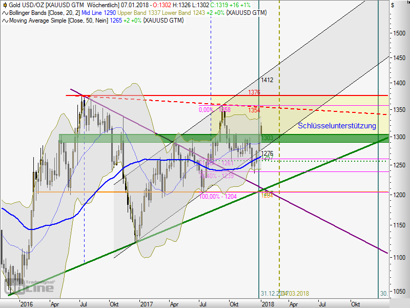 Ich würde sagen, wir hatten einen Fehlausbruch nach unten und sind wieder im Trendkanal drin. Hier sieht man auch schön, entweder Trendkanal wird weiter verfolgt oder laufen in die Trendspitze hinein und 2018 ist ein Jahr