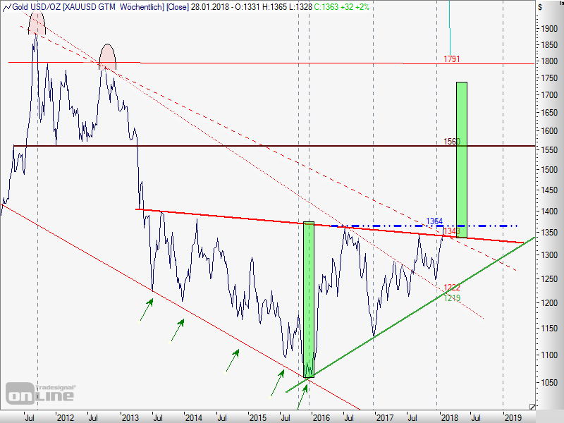 Gold kämpft weiter mit dem 'dicken Brett', ist an der momentan wirksamen Widerstandslinie (rot gepunktet) zunächst etwas abgeprallt. Der langfristige Abwärtstrend ist wohl 'Geschichte'. Ein Überwinden dieser Widerstandszone dürfte den Weg Richtung All Time Highs ebnen. Das formationstechnische Kursziel aus dem aufsteigenden Dreieck legt das nahe...