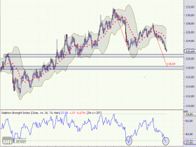 Der Momentumindikator ist unter die 50 gefallen.Das mittlere Bollingerband wird vermutlich nicht halten.
