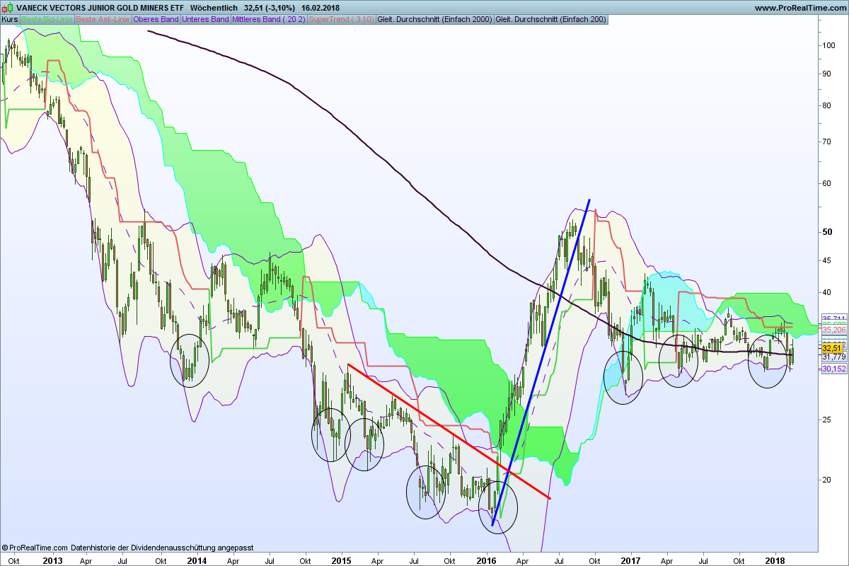 Im dargestellten Zeitraum durchlief der Kurs stets komplett die Wolke.GDXJ bewegt eher behäbig seinen Hintern aus der Tieflage, als dass er aus dem Sessel springt.