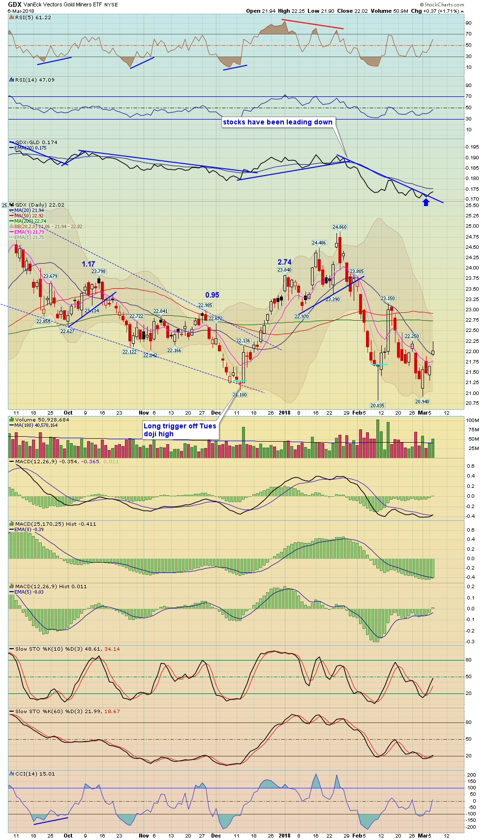Nicht schön die Schwäche zum Schluss, aber das sieht recht gut aus. 9 und 20 MA übersprungen, dem Abwärtstrend entwischt. Sehr positiv: GDX/GLD mit Kaufsignal. Der heutige Tag nicht ganz unwichtig, ein Halten des Gaps wäre sehr positiv, ein Schliessen des Gaps und gleich nach oben mit positivem Schluss wäre auch sehr positiv, ein Rückfall und Verbleib unter dem 9 MA wäre sehr enttäuschend. Mal schauen, was sich die Bankster in den USA für heute einfallen lassen. Zuerst müssen sie ihren eigenen Aktienindex retten, der in Schieflage geriet nach Börsenschluss aufgrund Trumps Personalpolitik. Vielleicht wird ja vergessen, dass man die Edelmetalle noch drücken könnte/sollte/müsste.