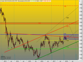 Voraussetzungen somit gut für eine grössere Bewegung nach oben. Mit grösserer Bewegung meine ich Kurse über 1400$. Was dies bedeuten würde im noch grösseren Rahmen dürfte auch klar sein, da alle Hauptwiderstände unter 1400$ zu finden sind.