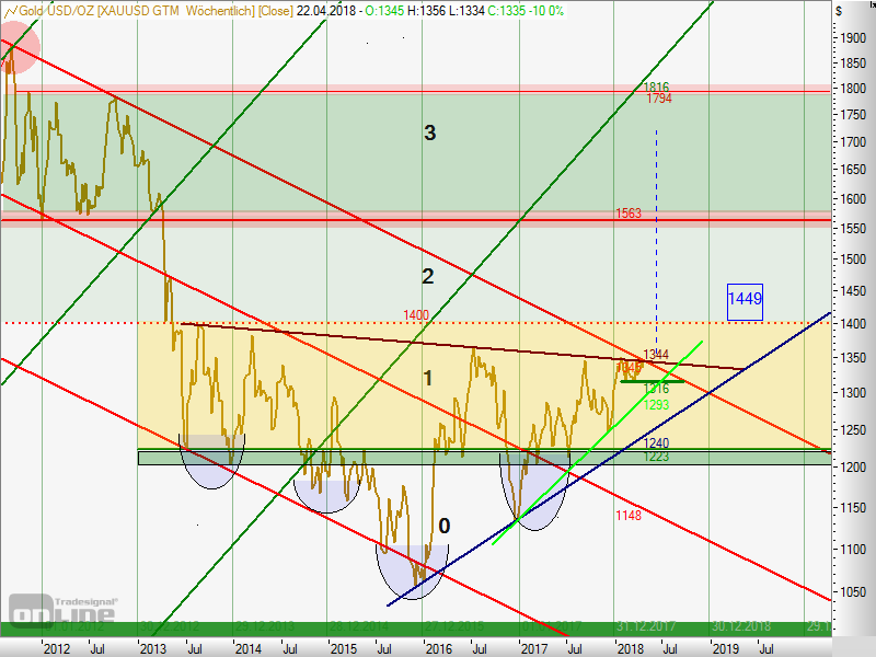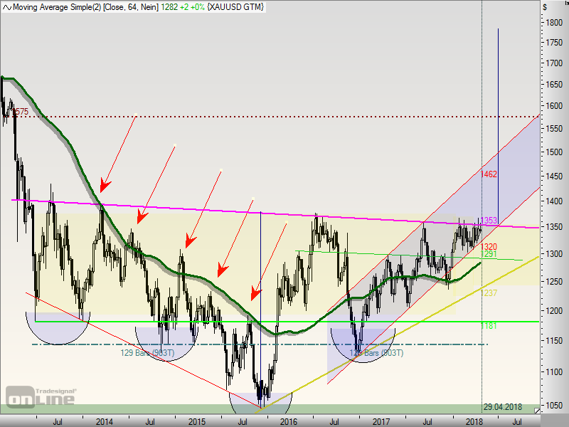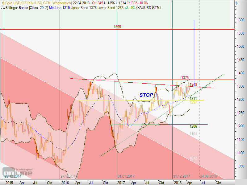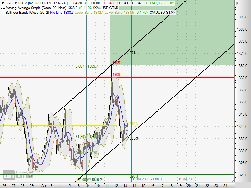 In den letzten 3 Monaten fiel der Goldpreis 2 mal auf das untere Bollingerband, einmal um den 07.-09. Februar und ein weiteres mal um den 15.-20. März. Danach gab es jeweils einen Anstieg von ca. 40US-$. Jetzt sind wir wieder einmal unten. Wenn das Muster hält, geht es ab morgen wieder gen Norden. Zum Ausbruch aus der Trading-Range würde es aber (leider) wieder einmal nicht reichen.