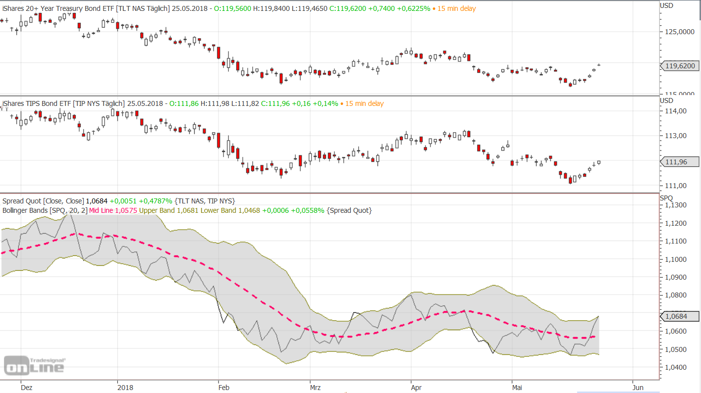 Der Ölpreis fällt stark. Die US-Anleihen mit langen Laufzeiten (TLT) steigen zu den Inflationsanleihen (TIPS) und auch zu Gold. Die Inflationserwartungen sinken.