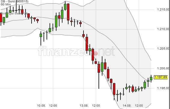 Das beim POG seit heute Morgen zusammenlaufende Dreieck hat sich nach oben aufgelöst; der POG schiebt sich im 5-Minuten-Chart aktuell gemächlich im oberen Bollingerband nach oben: