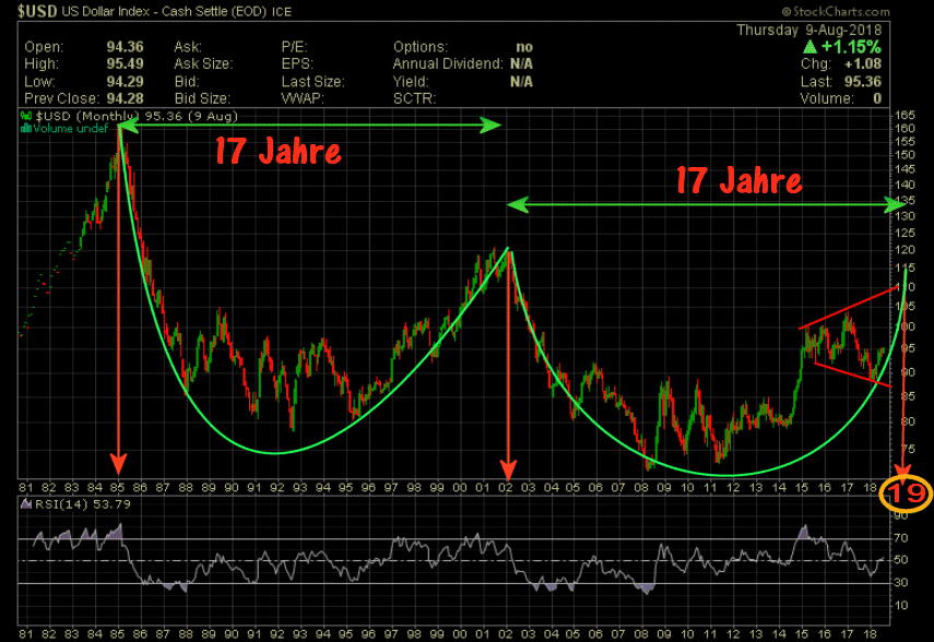 der Trade Weighted USD-Index hat im Vergleich zum klassischen USD-Index einen kürzeren Abstand von ca. 15 Jahren