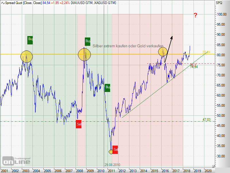 Silber/Gold Ratio: die Lage 'spitzt' sich zu . Positiv: das Ratio im Bereich langfristigen Supports.