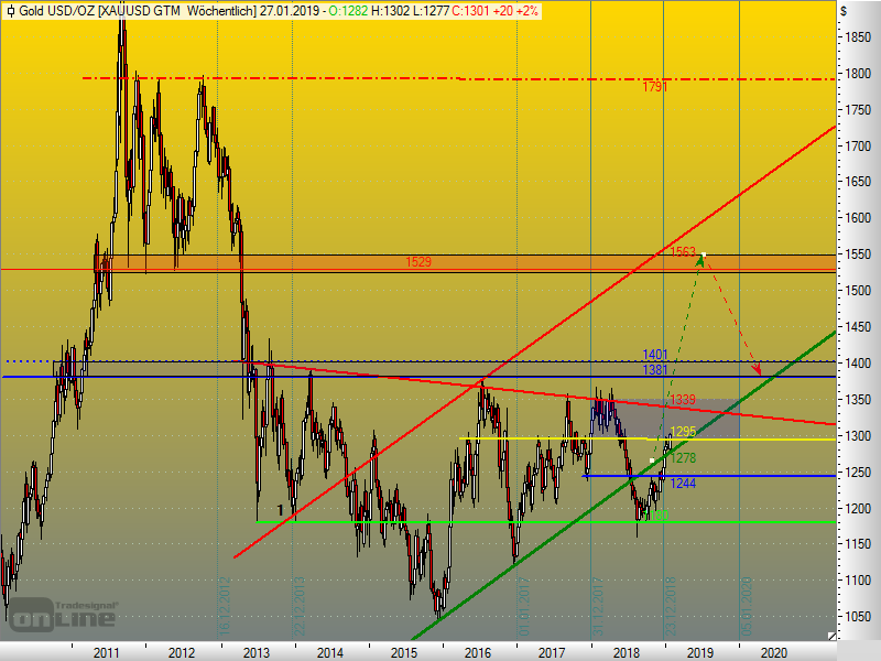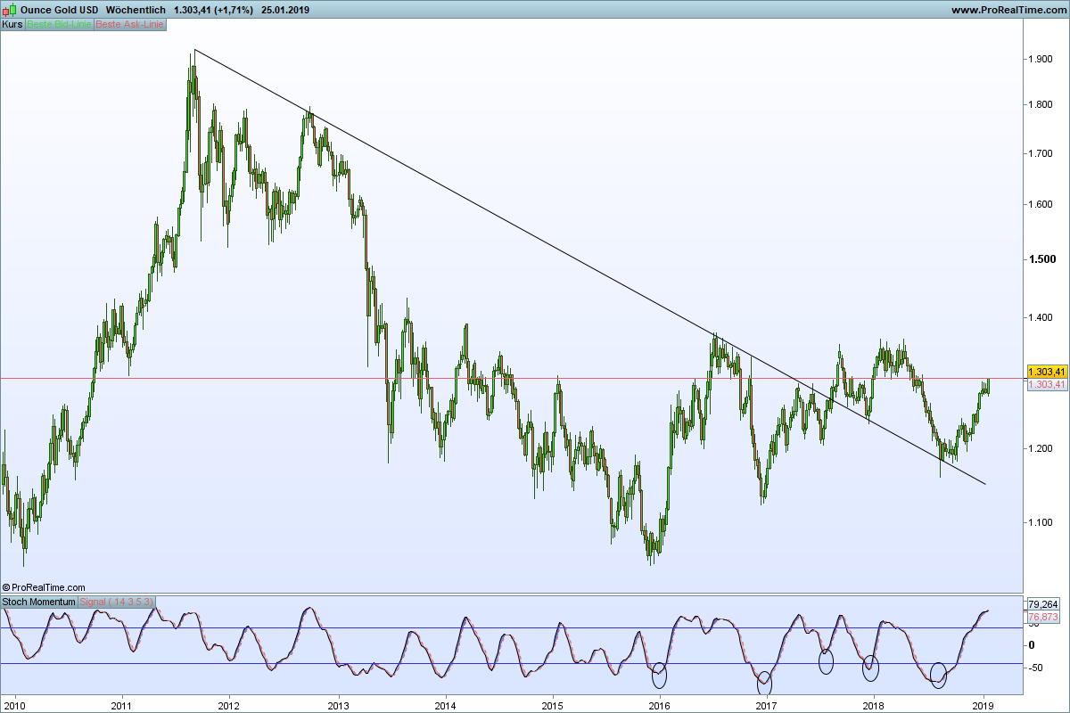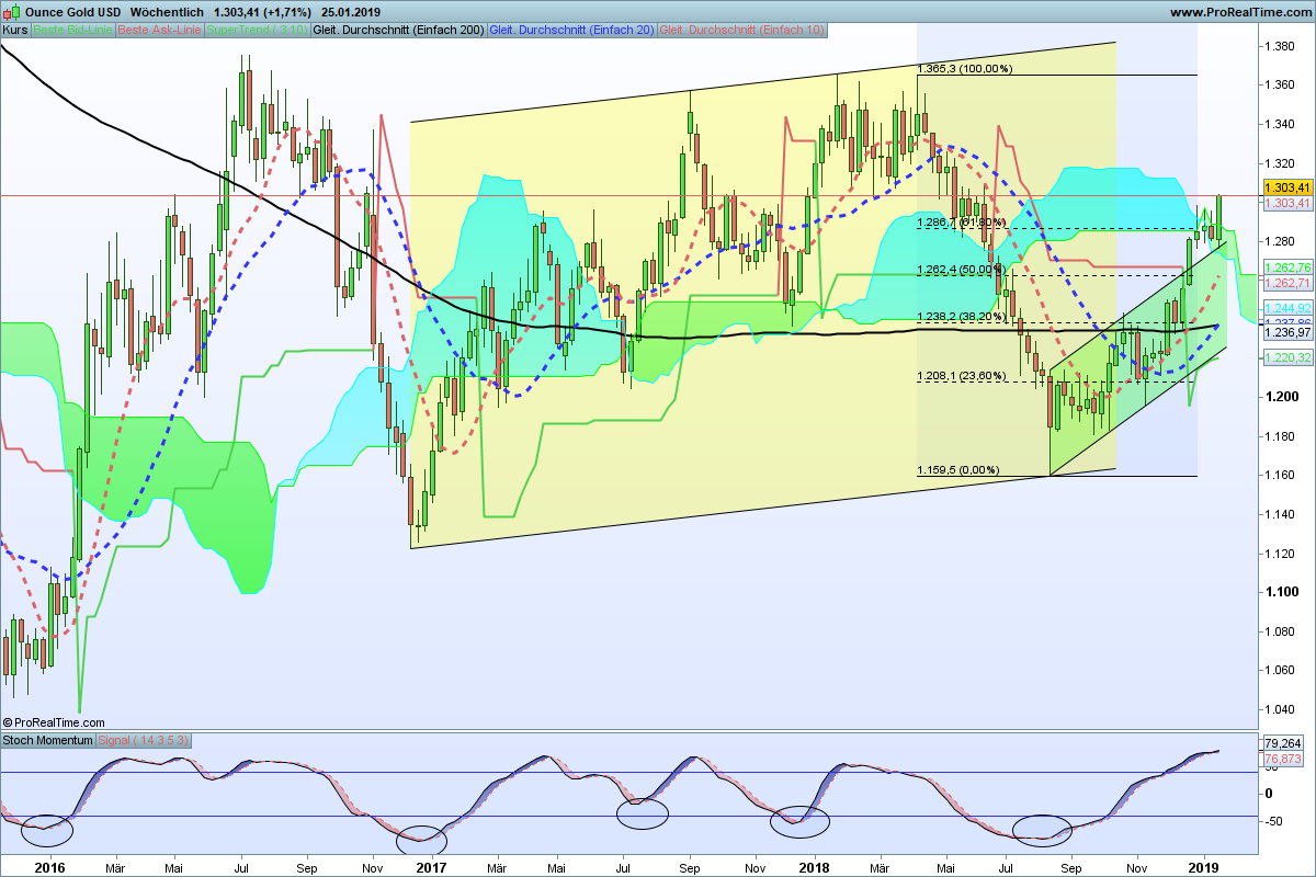 Zitat von Dr. Jens EhrhardtDie vielen Unsicherheiten dürften dazu führen, dass mittelfristig weitere Steigerungen beim Goldpreis zu erwarten sind (2018 besseres Anlageinstrument als alle großen Aktienbörsen). Möglich aber, dass Gold kurzfristig etwas billiger wird, da markttechnisch gesehen der Optimismus etwas zu stark gestiegen scheint.