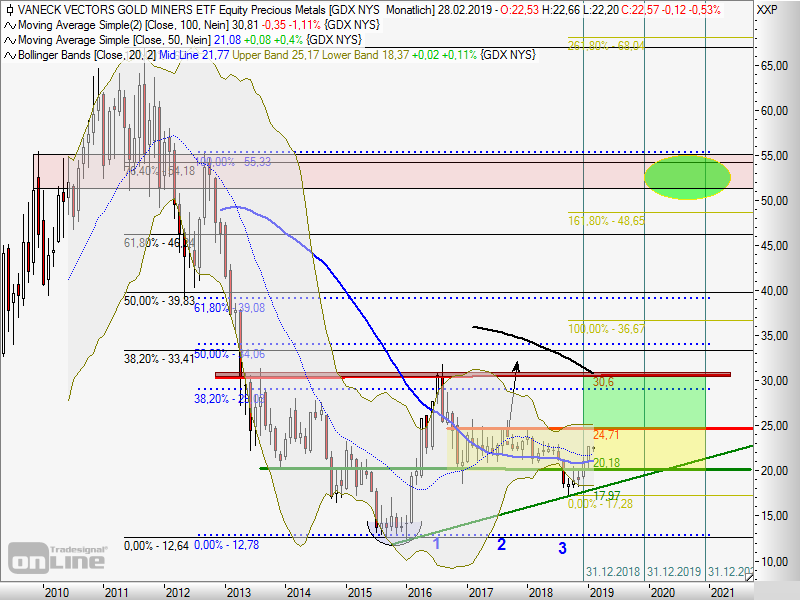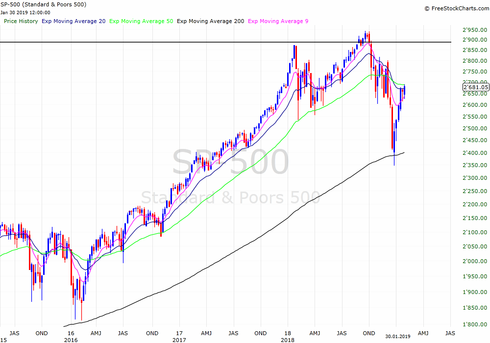 Chart 2: S&P 500 Weekly. Hier ist der grüne 50 EMA zu betrachten. Während des Aufwärtstrendes seit 2016 war der 50 EMA die entscheidende Unterstützung. Jetzt hoffentlich der entscheidende Widerstand. Intraweek darf der Kurs noch etwas drüberschauen, deshalb heute noch höhere Kurse möglich. Ab morgen muss es wieder drunter sein....