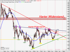 "... Mitte August markierte das Edelmetall ein Jahrestief bei 1.160 USD. Dort meldeten sich die Bullen schließlich zurück und es kam zur erneuten Etablierung eines Aufwärtstrends, der weiterhin intakt ist und zur nachhaltigen Überwindung der 200-Tage-Linie führte. Nach dem Bruch des wichtigen horizontalen Widerstands bei 1.309 USD Ende Januar erreichte der Kurs bis zum gestrigen Handel ein 10-Monats-Hoch bei 1.347 USD und nahm damit Tuchfühlung mit dem Widerstand der steigenden Widerstandslinie über die beiden Hochpunkte der letzten Wochen auf. Angesichts der überhitzten Markttechnik auf Basis des Tagescharts sowie negativer Divergenzen in momentumbasierten Indikatoren muss nun eine erhöhte Wahrscheinlichkeit für eine kurzfristige Konsolidierung oder auch einen deutlicheren Rücksetzer vor dem Abarbeiten des im Fokus stehenden mittelfristigen Zielbereichs 1.356-1.375 USD unterstellt werden. Potenzielle Auffangbereiche für den Fall eines Pullbacks lassen sich bei 1.326 USD, 1.310-1.317 USD und 1.303 USD ausmachen. Die Verletzung der letztgenannten Marke würde das technische Bild deutlicher eintrüben und für eine mehrwöchige Korrekturphase sprechen, die den Kurs in Richtung 1.287/1.291 USD, 1.277 USD und 1.246-1.251 USD fallen lassen könnte. Erst darunter würde der seit August etablierte Aufwärtstrend in Frage gestellt. Ein nachhaltiger Anstieg über 1.275 USD ist zur Generierung eines langfristig bedeutsamen Anschlusskaufsignals mit potenziellen Zielen bei 1.433-1.452 USD, 1.472-1.484 USD und 1.522-1.531 USD erforderlich."