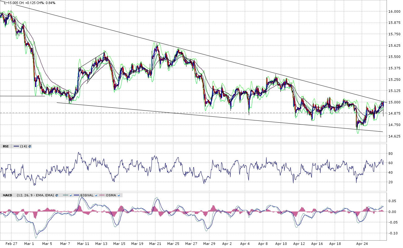 • Stundenchart Silber: Das Wedge ist ja wohl allen aufgefallen. Was mich positiv überrascht: Silber macht mir den besseren Eindruck als Gold. Noch lange nicht über dem berg, aber ein Boden erscheint mir recht realistisch. Dies würde dann auch Gold und Goldaktien miteinbeziehen, obwohl Goldaktien für meinen Geschmack nach unten so ziemlich das Letzte rausgereizt haben und nicht mehr viel passieren darf. GDX bei 21 habe ich als Idealziel betitelt, unter 20.50 wäre dies dann nicht mehr ok.