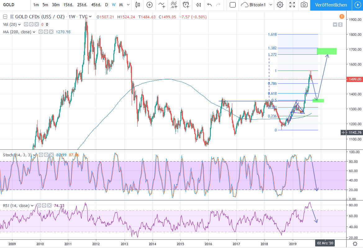 Das ultra bullische Goldrausch-Szenario deutet auf eine riesige Cup&Handle-Formation hin. Demnach wären in den kommenden Monaten weitere steile Kursanstiege zu erwarten und der Goldpreis könnte bis Anfang Januar bis ca. 1.800 US-Dollar ansteigen. Im Anschluss wäre dann eine zwei- bis dreijährige Korrekturphase in Richtung 1.500 und vermutlich 1.350 US-Dollar zu erwarten, die übrigens gut zu der erwarteten Banken-Pleitewelle (Deflation) von Dr. Markus Krall passen würde!
