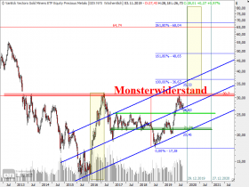 Wichtig ist die mittlere Trendlinie 26,88 nicht zu durchbrechen. Dann in 2020 das 2016er Hoch durchbrechen und dann sollten wir den oberen Trendkanal verlassen und dann sollte es richtig dynamisch werden mit Ziel ca.65-80...danach eine längere Korrektur mit Ziel zwischen 45-32...Monsterwiderstand zu Monsterunterstützung!!