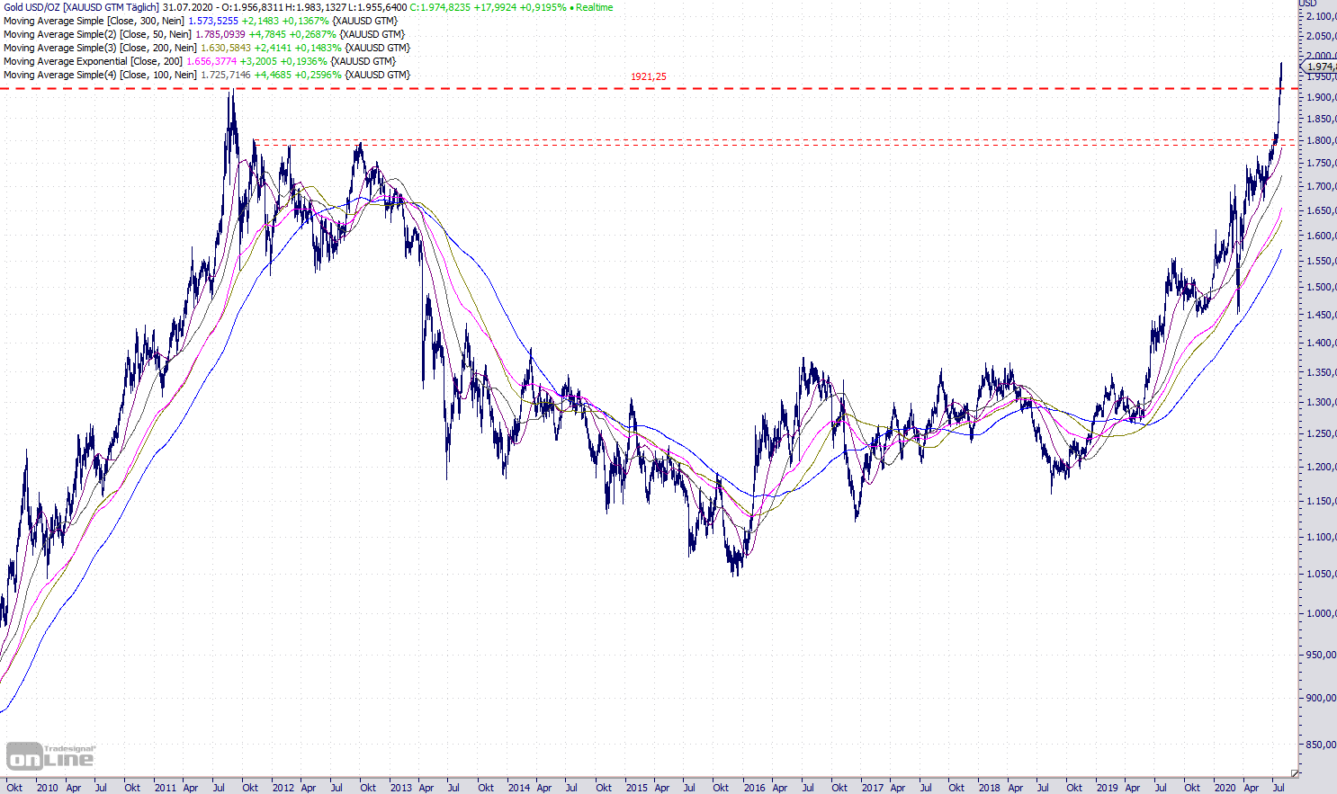 Die Goldpreise am US-Terminmarkt und am Spotmarkt (FOREX) weichen zeitnah aber nur gering von einander ab. In beiden Fällen ergibt sich gegenüber Vorwoche ein Anstieg von rund 4 Prozent. Der August-Kontrakt schloss am Freitag bei 1.973 US-Dollar pro Unze. Der Spotpreis ging mit 1.975 US-Dollar ins Wochenende. Allerdings wurde der Dezember-Kontrakt zuletzt am meisten gehandelt. Hier zahlten Händler bereits 1.994 US-Dollar für eine Lieferung zum Jahresende.