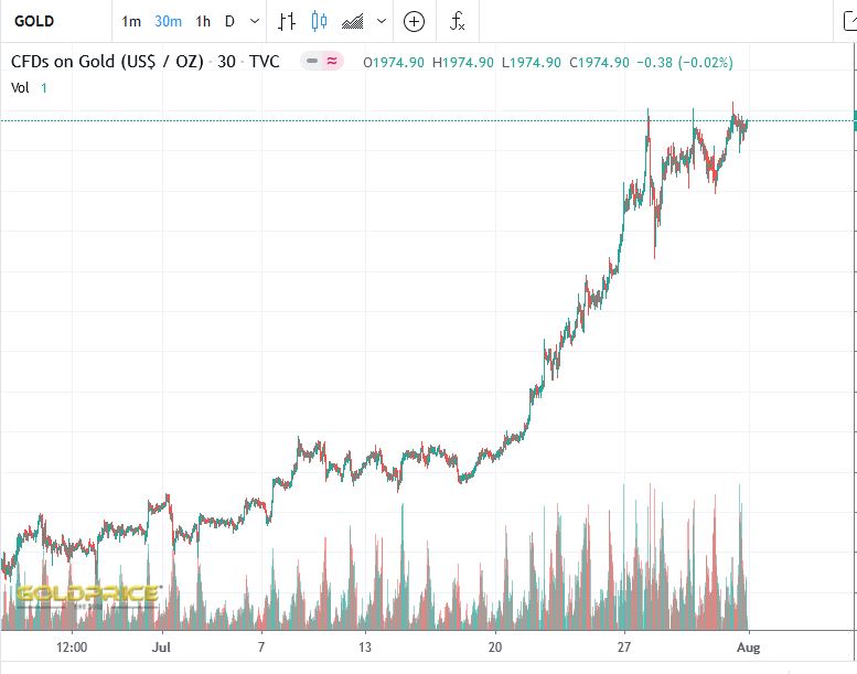 Die Goldpreise am US-Terminmarkt und am Spotmarkt (FOREX) weichen zeitnah aber nur gering von einander ab. In beiden Fällen ergibt sich gegenüber Vorwoche ein Anstieg von rund 4 Prozent. Der August-Kontrakt schloss am Freitag bei 1.973 US-Dollar pro Unze. Der Spotpreis ging mit 1.975 US-Dollar ins Wochenende. Allerdings wurde der Dezember-Kontrakt zuletzt am meisten gehandelt. Hier zahlten Händler bereits 1.994 US-Dollar für eine Lieferung zum Jahresende.