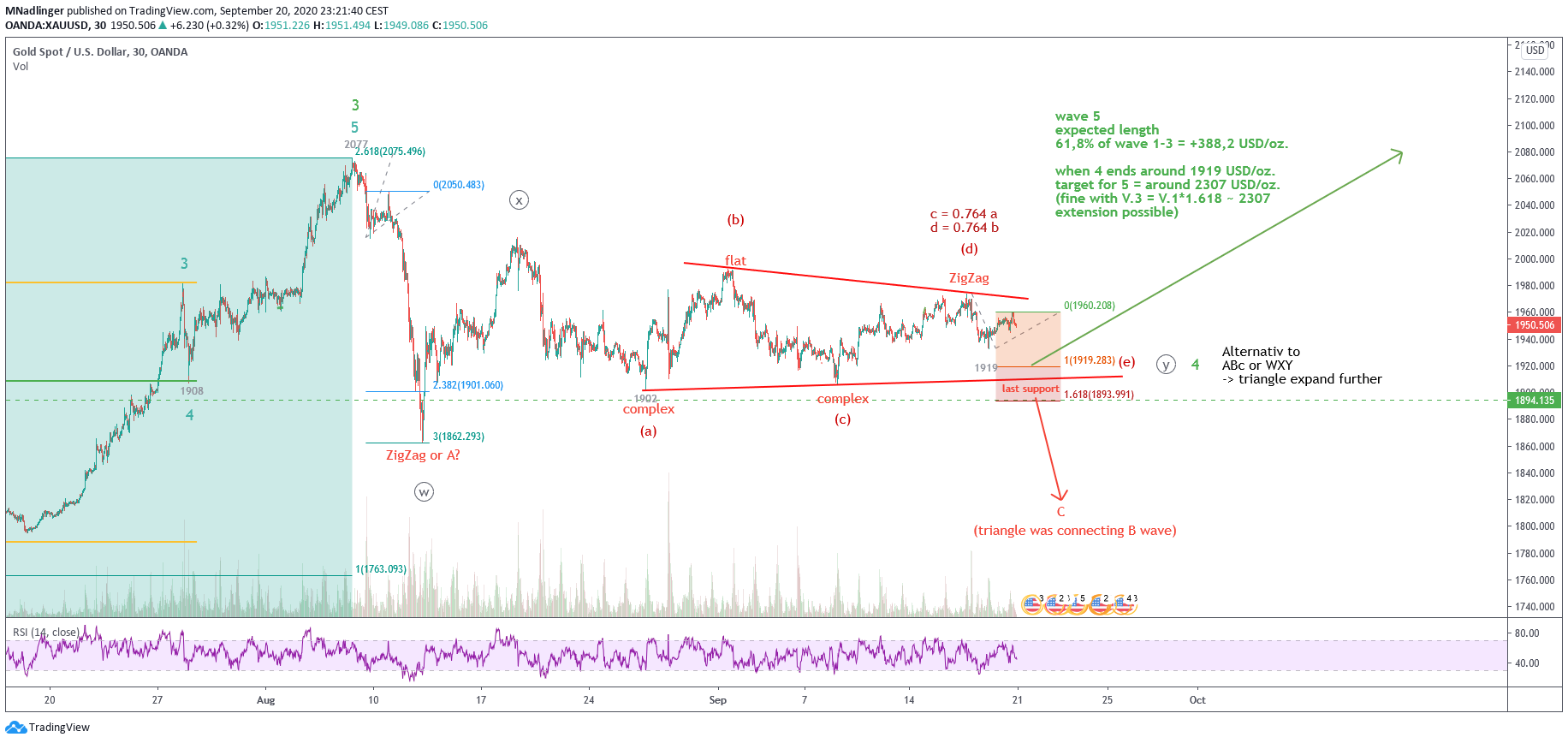 Update: Die aktuelle Korrektur ist komplex und schwerer in Muster zu gießen und erst jetzt habe ich wieder ein bisschen Orientierung was es werden könnte. Unten ein Ansatz der (unser) Wunschdenken mit Realität verbindet: Doppel-Kombination von scharfer ABC Korrektur mit Triangle welches bereits bei 1919 enden könnte. Darauf aufbauend würde das Ende der Welle 5 bei ca. 2306 USD/oz. liegen - genau der Bereich den captainewave auch für möglich hält. Zudem passen innerhalb des symetrischen Dreieck die Relationen gut und bei einem Ende bei 1919 würde die letzte Welle e klassisch nicht mehr zur Unterstützung gehen. Zudem wäre bei diesem Ende von rund 1919-1920: (e) = 0,618*(c). Zudem ist 50 Tage MA gerade die Unterstützung und wir habe eine Kosolidierung bei abnehmenden Volumen auf Tagesbasis!