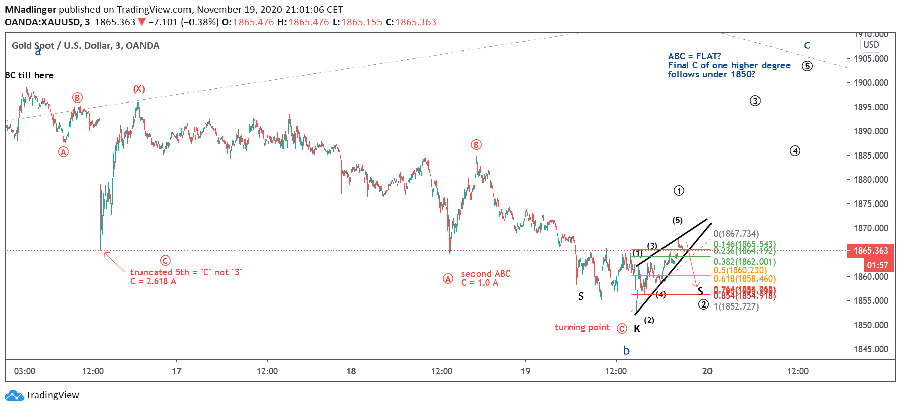 Das könnte ein ausgeflixtes FLAT (=Welle B) werden bevors final noch leicht nach unten geht (=Welle C) bis dann der nächste mittelfristige Aufwärtsimpuls (übergeordnete Welle 5) losgeht.Seltenes, ausgeflixtes FLAT: Zurückblickend war ich bis heute ratlos das zu zählen weil, weder Ausbruch nach unten (1850) oder oben (1900). Zudem passt für Welle A ein schönes ZigZag, ABC, und für Welle B die wohl heute ihr Ende fand ein doppel ZigZag. Wer möchte kann die perfekten Propoertionen nachmessen - es findet sich sehr schwer in Abwärtsimpuls oder Diagonal der letzten Bewegung von 1899 bis 1852! Daher Vermutung FLAT, zudem bildet sich aktuell ein Boden aus in einer SKS Formation auf Stundenniveau, auf Ellitt Ebene betrachtet begleitet von einem Leading Diagonal, dessen Proportionen dems sehr schön dem goldenen Schnitt entprechen (Welle 4 teilt die Bewegung 0.382:0.618 auf).