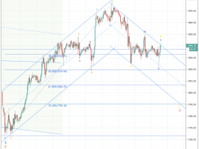 Doppel ZigZag: Es folgt jetzt nur mehr ein Impuls = C nach Erholung auf rund 1840. Diese Welle C könnte bis 1819 oder bis 1806 Dollar gehen. Tippe mal auf so auf 1807$, da sieht auch jeder wir sind am 61,8% Retracement, was doch zu echten Käufen führen kann. Zeitlich könnte das schon morgen Nachmittag über die Bühne gehen.