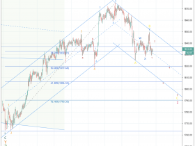 Doppel ZigZag: Es folgt jetzt nur mehr ein Impuls = C nach Erholung auf rund 1840. Diese Welle C könnte bis 1819 oder bis 1806 Dollar gehen. Tippe mal auf so auf 1807$, da sieht auch jeder wir sind am 61,8% Retracement, was doch zu echten Käufen führen kann. Zeitlich könnte das schon morgen Nachmittag über die Bühne gehen.