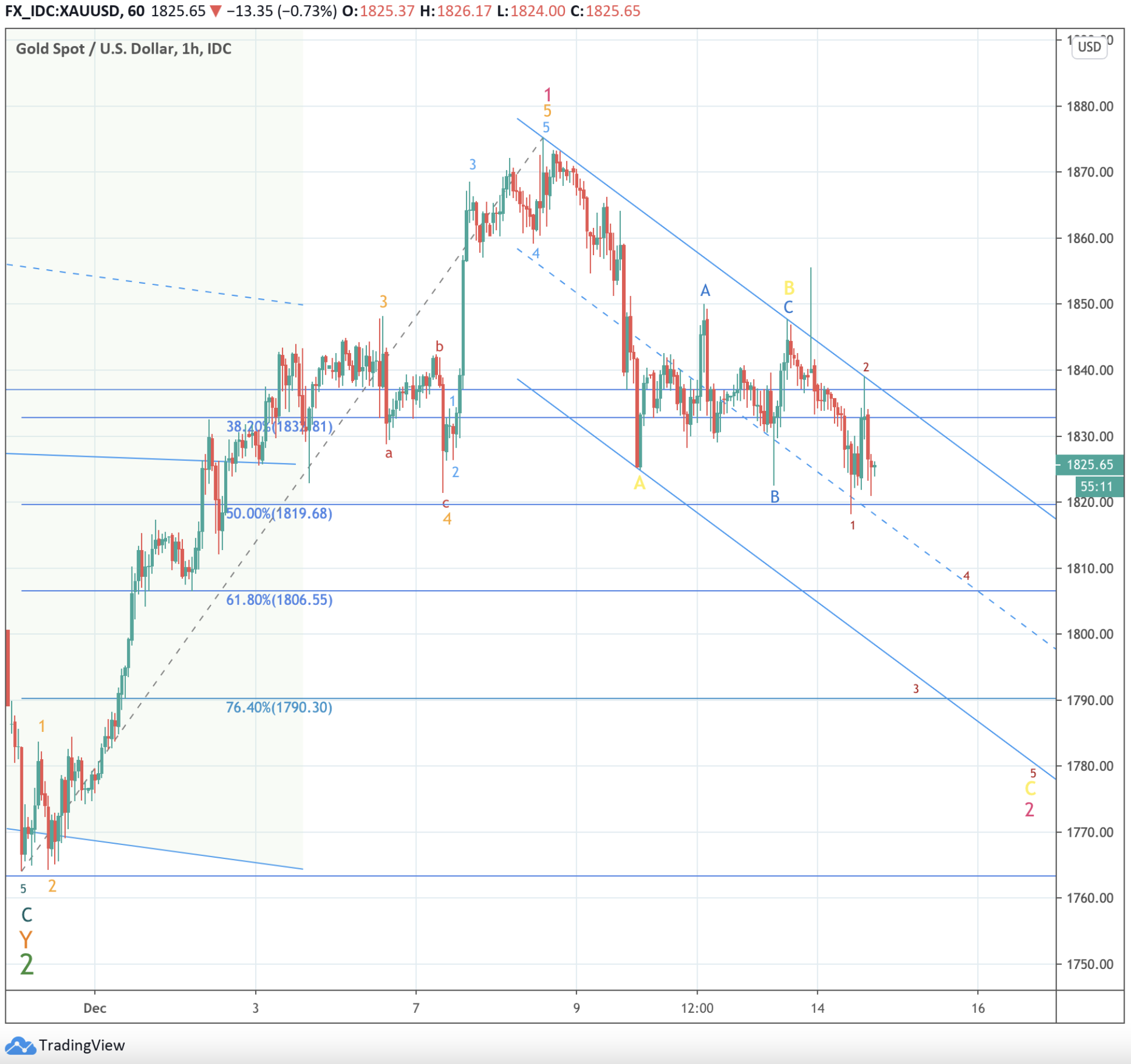 Entweder es kommt bis morgen 16:02 der finale Abverkauf und es geht wie @Nebelparder beschrieben hat nochmals impulsiv nach unten Richtung 1800 und dann eventuell weiter bis 1780-1790. Oder es ist ein vollendetes Doppel-ZigZag bis 1819 USD statt 1807 USD wie skizziert, welches zumindest einigermaßen ins Bild passt. Nur um diese Alternative nicht auszuschließen...