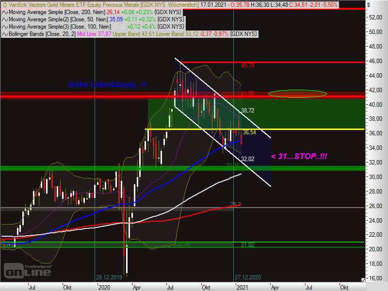 Der GDX aktuell zwar horizontal unterstützt inkl. RT 38 , allerdings hat der GDX im Tageschart den GD 200 deutlich unterschritten, dazu ein bärisches cross-over von GD50/GD 200 (aka Todeskreuz)...