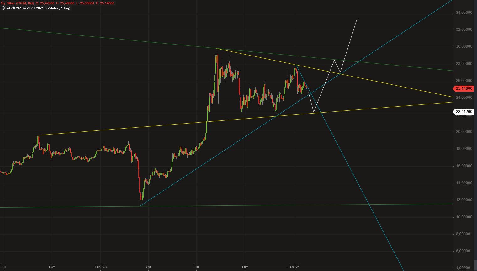 Falls Silber das blaue Dreieck bei ca. 24,3$ nach unten verlässt wäre das mein grober Fahrplan ... Könnte aktuell auch noch direkt nach oben drehen, aber ich denke wir sollten spätestens morgen ein wenig schlauer sein ...