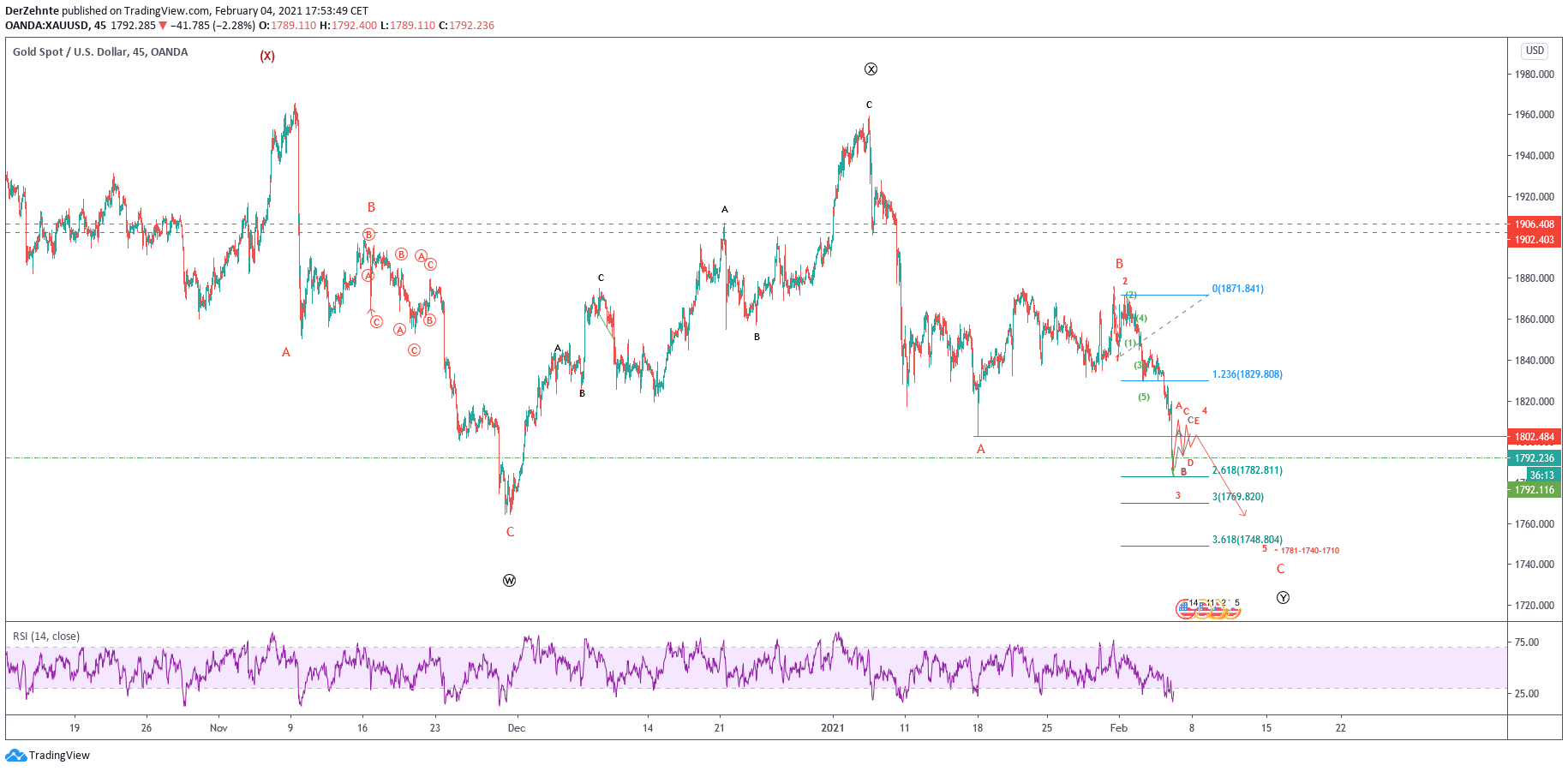Unten meine Zählung für den aktuellen Impuls einer ABC Korrektur und einem übergeordneten WXY mit Ziel um die 1740. Maßgeblich wäre nun heute ein Halten bei 1782 und dann nochmal Backtest und hoch bis 1800-1805 im Falle einer ABC/WXY oder etwas darüber um sich in einem Triangle bei rund 1800 auszupendeln.Anschließend nochmals Richtung bzw. mit einem Spike auf 1740. Das deckt sich auch mit den MA64 weekly bei 1750 wie von @woernie. 1740 ist aktuell mein primäres Kursziel.