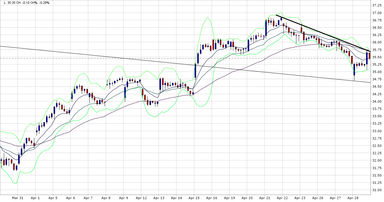 Seither lassen sich innerhalb dieses fallenden Trendkanals mindestens zwei weitere Trendkanäle einzeichnen, die als Versuche aufgefasst werden können, denn fallenden Trendkanal nach oben zu verlassen. Der erste Versuch endete kurz nach dem Jahreswechsel mit einem Fehlausbruch. Der zweite, aktuell noch „aktive“ Versuch wird seit einigen Tagen von der oberen Begrenzung des fallenden Trendkanals eingebremst.
