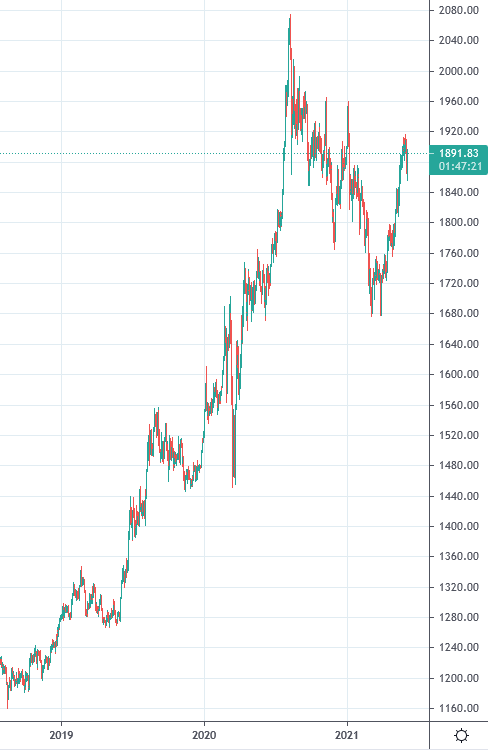 • Der MA200 liegt bei 1840 USD. Soweit dürfte es mindestens wohl gehen. Gelegentlich wird der MA200 bei Korrekturen kurzfristig unterschritten. Ich würde mal sagen, dass wir das Tief bei ca. 1825 sehen.