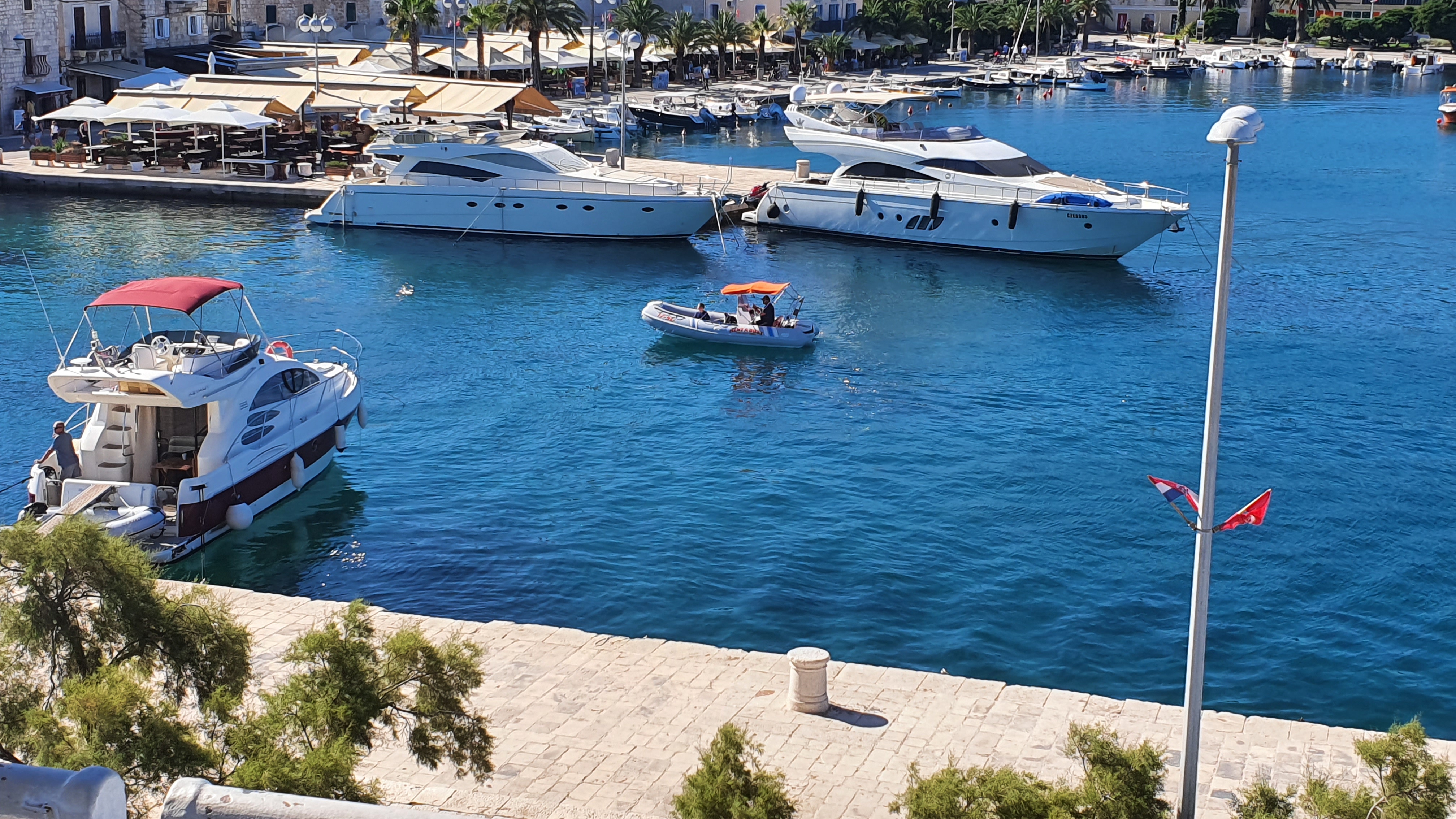 Bis vor drei Jahren war es so, dass man in der Marina sein Boot ‘parken‘ (Tagesliegeplatz ca. 100 €) oder auf der Krka gegenüber des Ortes (umsonst) ankern konnte. Zu den Wasserfällen fuhren Fähren. Fährpreis im Eintrittspreis zu den Wasserfällen inbegriffen.(Eintritt inzwischen ca. 30 €) Wer noch nie da war: lohnt sich! Toller Spaziergang über alle Ebenen dieser einzigartigen Wasserlandschaft. Škradin, ein kleines Örtchen mit familiärem Ambiente. Mit netten Restaurants , Bäckerei und relativ gut sortierte Lebensmittelläden. Vor 3 Jahren wurde eine Bojenkonzession vergeben. Natürlich an die ACI, den Marinabetreiber. Boot an der Boje anbinden: 60 €. Ankern in 150 m Entfernung von konzessionierten Bojenfeldern ist in Kroatien grundsätzlich erlaubt. Also fuhr man eben 150 m flußaufwärts und ankerte da. Vor 2 Jahren wurde das Bojenfeld flußaufwärts ausgeweitet . Ankern somit nicht mehr möglich. Fuhr man eben 150 m flußabwärts und ankerte dort. ![]()