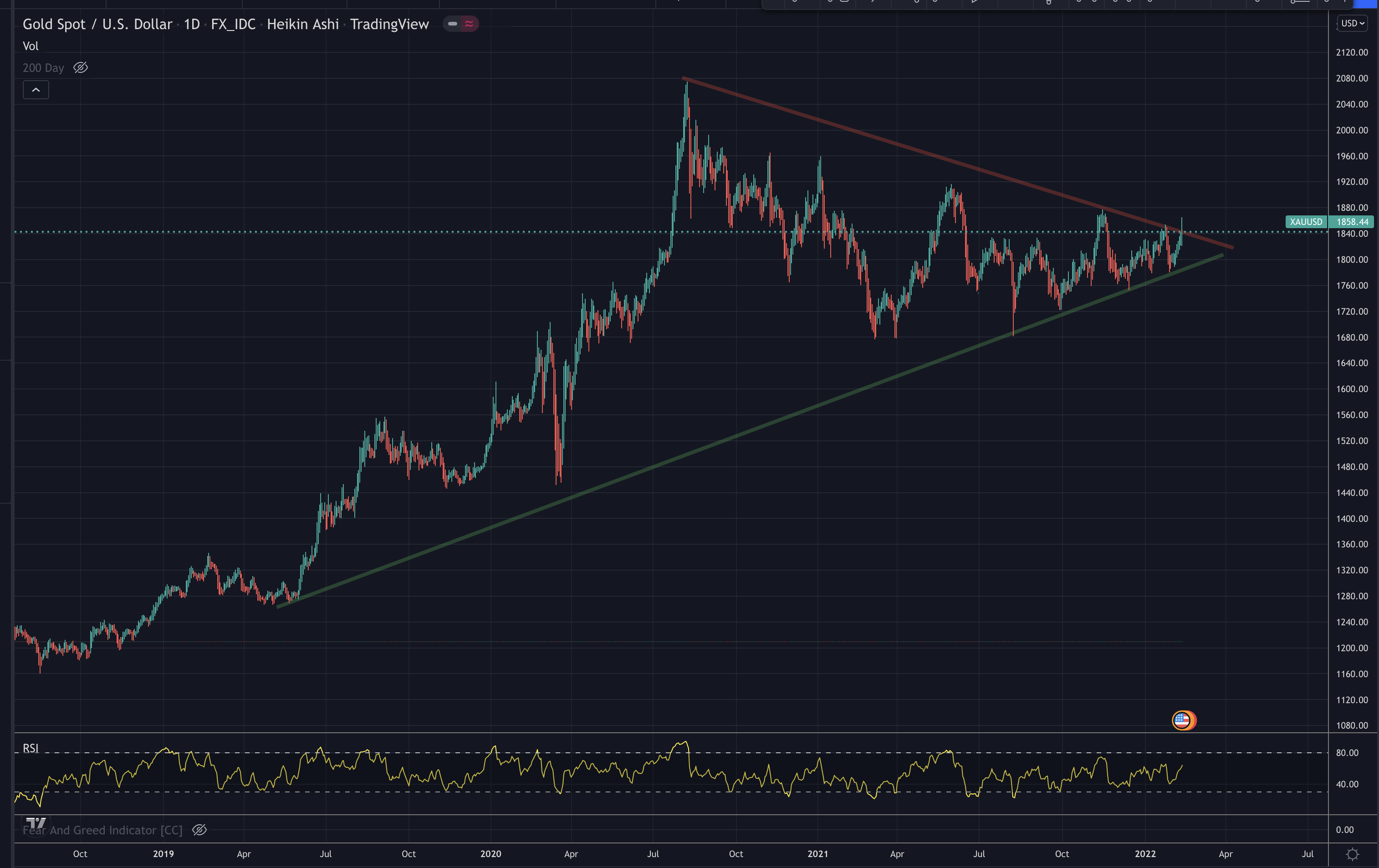Wir sind bei den Indizes genau in der kritischen Zone. Das sieht man sehr schön im GDX und Xau. Schaut man langfristig auf die ATH dann war die Woche nur ein Tropfen auf dem heißen Stein. Ob mehr daraus wird, muss man sehen, brauchen einen Ausbruch!!!Es ist klar ein Bullenkeil...kommt jetzt der Ausbruch? Das wäre ein starkes Zeichen!