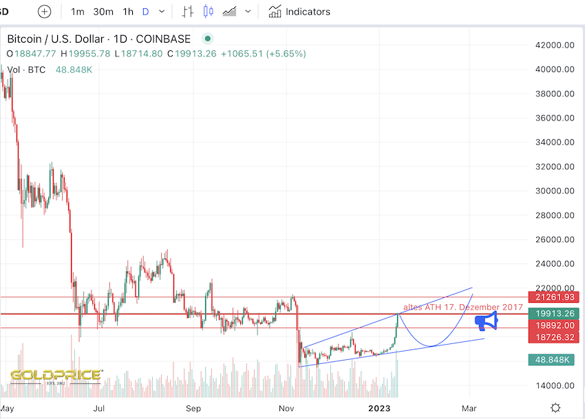 BTC läuft an sein altes ATH vom 17. Dezember 2017 heran, scheitert mit seiner Fahnenstange, bildet ein Megaphon, und verschwindet danach im Orkus.