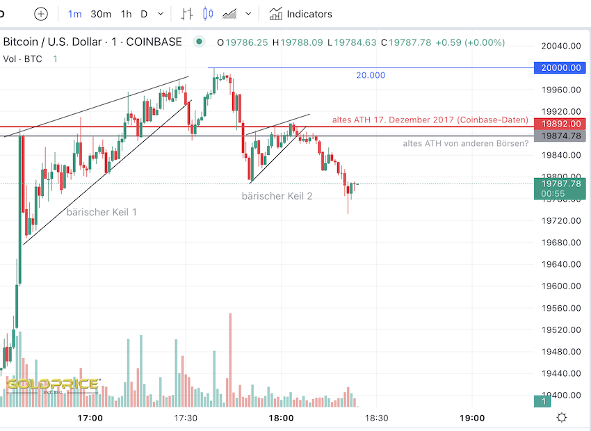 BTC läuft an sein altes ATH vom 17. Dezember 2017 heran, scheitert mit seiner Fahnenstange, bildet ein Megaphon, und verschwindet danach im Orkus.