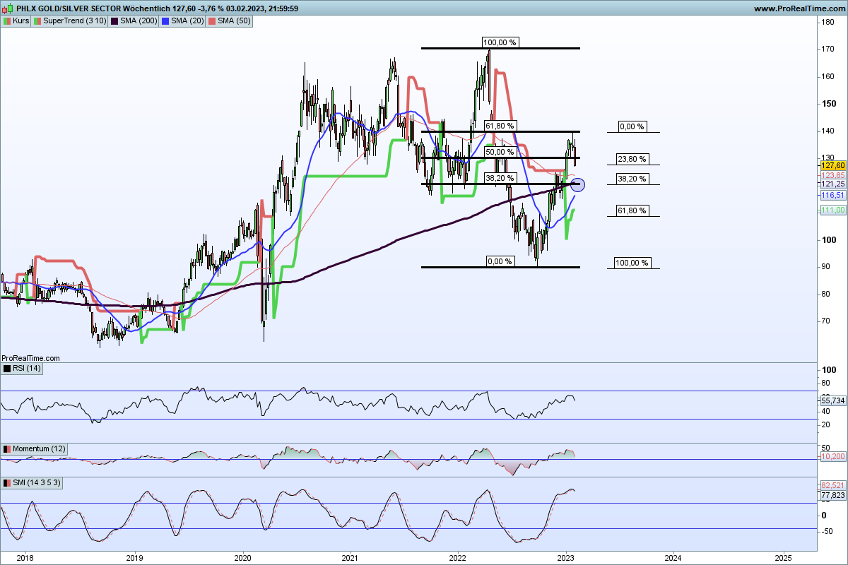 Gestern bin ich bei 24,30 in die Absicherung gegangen, nachdem Silber an der Abwärtstrendlinie gescheitert ist. Der 200-Tagesschnitt liegt irgendwo 21, es wäre schön, wenn Silber hier einen Henkel ausbilden würde.