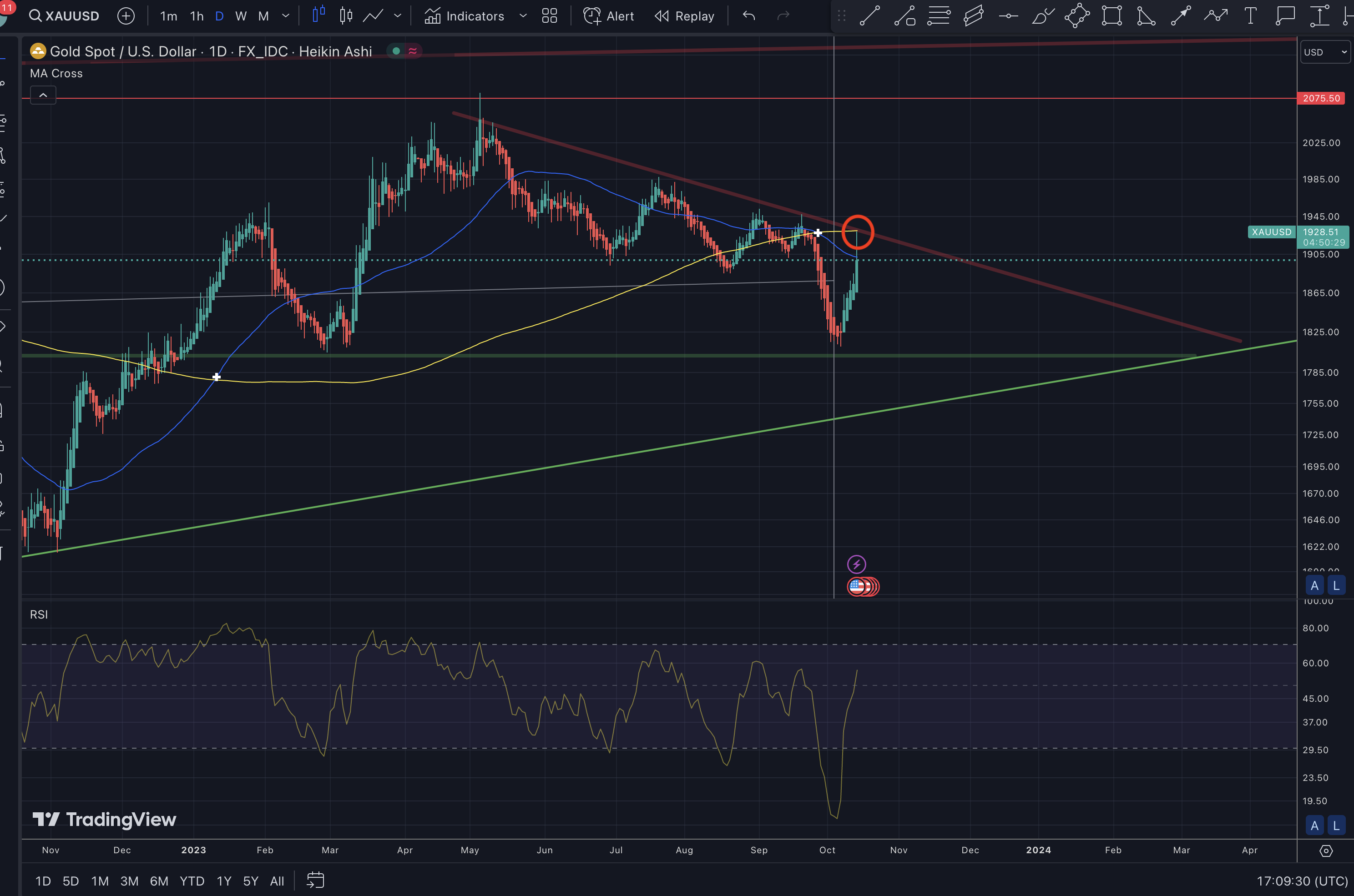Am 06. Oktober, das war ein Freitag, habe ich geschrieben, dass an diesem Tag oder am nächsten (Montag) das Tief stattfinden sollte. Das Tief erfolgte am 06. Oktober 2023 bei 1.810 $.