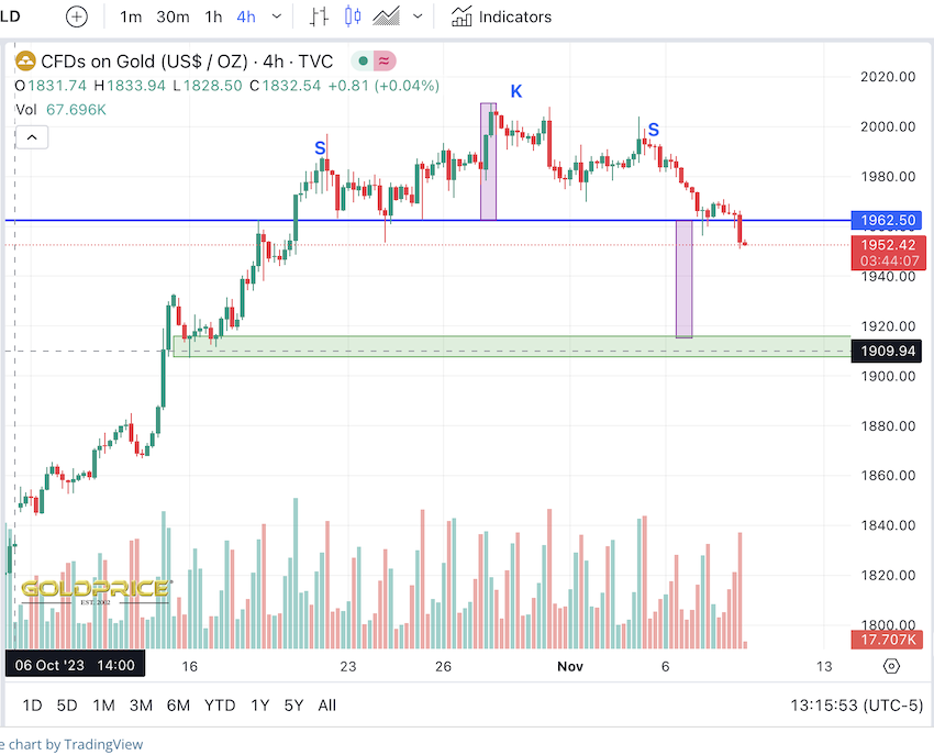 Die Höhe der SKS nach Süden abgetragen, führt zu einer grünen Unterstützungszone im Bereich 1.915 - 1.908 $. (Bei 1.910 $ verläuft übrigens auch das 50er RT der Bewegung seit 6. Oktober siehe letzter Post von mir hier im Faden.)