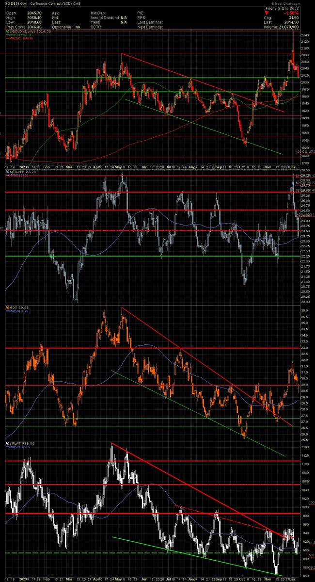 ...die Anstiege die dem (vermeintlichen) Goldausbruch voraus gegangen sind , sind , wie die hier dargestellten Fibo-RT's belegen inzwischen Makulatur: Gold und Silber notieren unter den 62 ern des letzten Anstiegs. Will sagen: zurück auf Los ! Platin am 62 er , die Minen (leicht bullische Divergenz) noch knapp darüber.