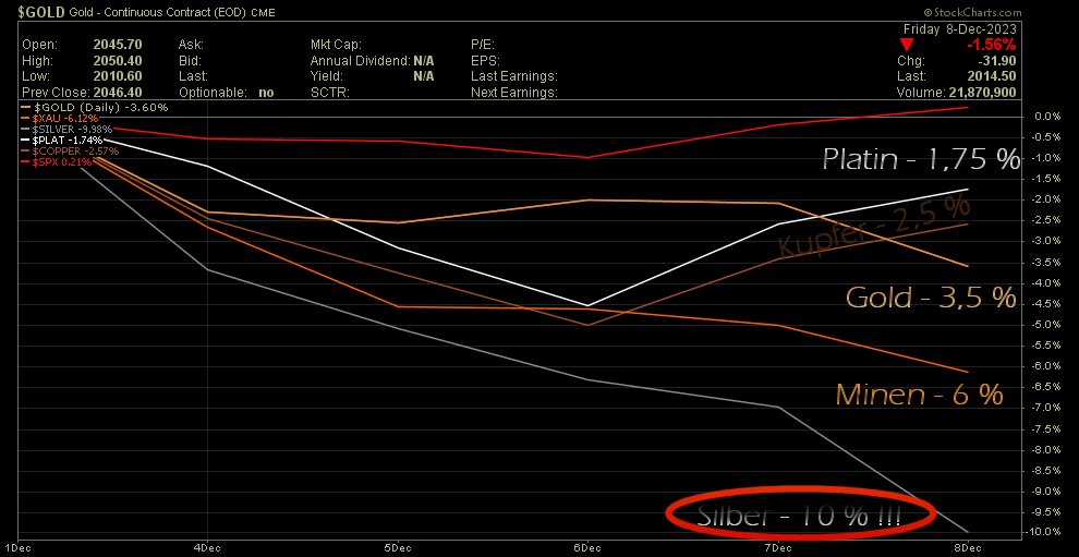 Silber hat gleich 3 (drei !!!) Unterstützungen durchschlagen. Hab' sowas innerhalb einer Woche selten erelebt...Positiv : die ganze Metall-Bande notiert weiter oberhalb steigender 50 Tage-Durchschnitte. Gold sogar mit einem 'golden cross'. Das bullische Bild ist also (noch) nicht komplett zerstört.
