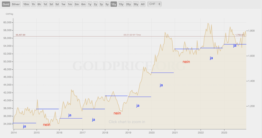 Wenn der Kurs im folgenden Jahr meist höher war, dann war es sinnvoll zum Jahreswechsel Gold zu kaufen, gab es später ausgedehntere Zeitfenster, um die Knöpfe günstiger zu erwischen, war es nicht sinnvoll.
