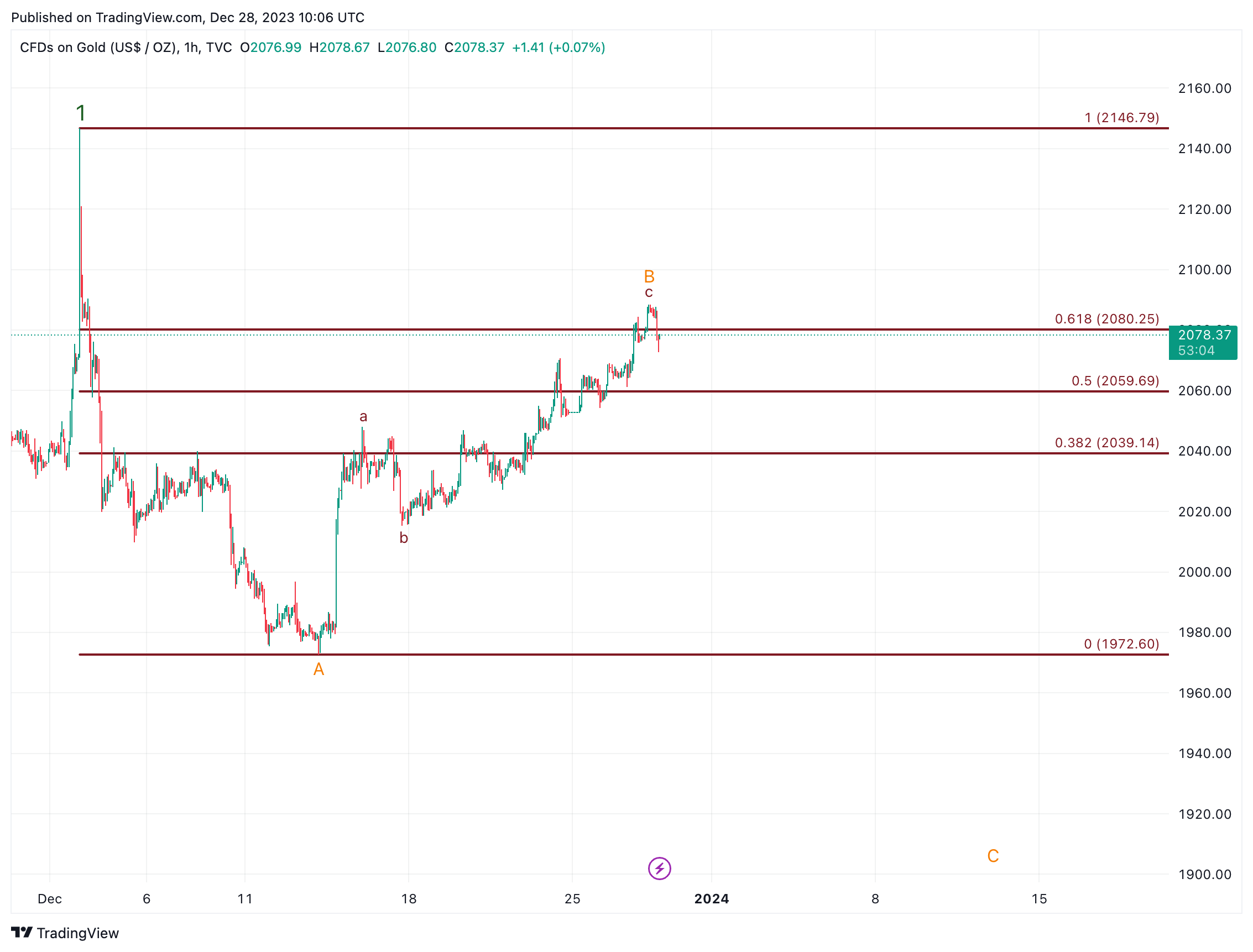 Eine symmetrische (a = c) a-b-c-Korrektur vom 2150$ Top würde Gold nochmals in den Bereich 1935 $ bringen. Dies würde aber, auch bei Goldaktien, aktuell schöne Strukturen kaputt machen und es könnte noch eine Weile dauern, bis man sich wieder in eine gute Ausgangslage bringen würde.