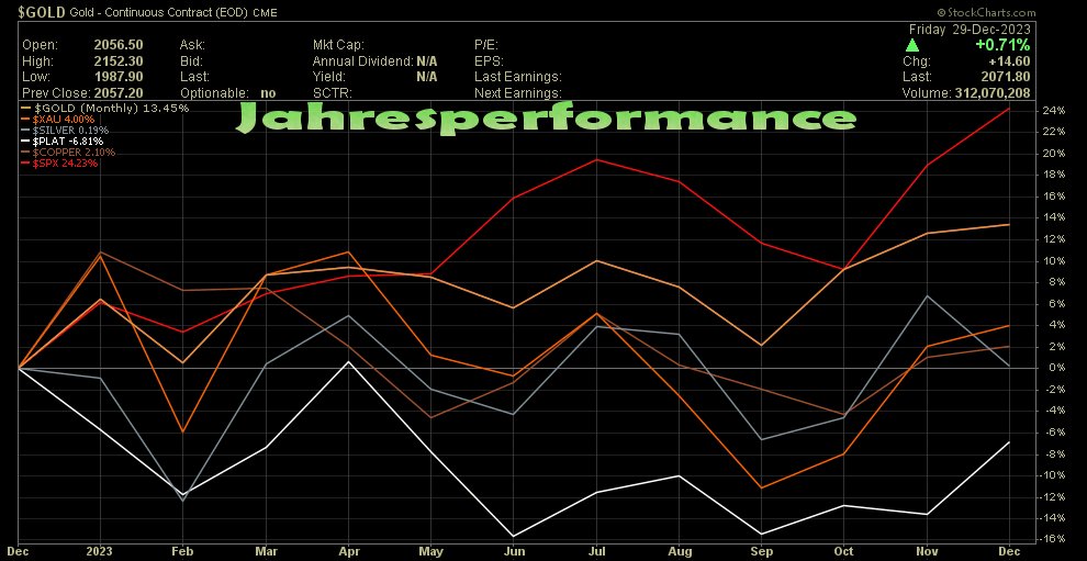 Mehr oder weniger deutlich: 'explosive' Dreiecksformationen bei allen Metallen. Die Dreiecke dürften nächstes Jahr getriggert werden. Ich denke in die 'richtige Richtung' !