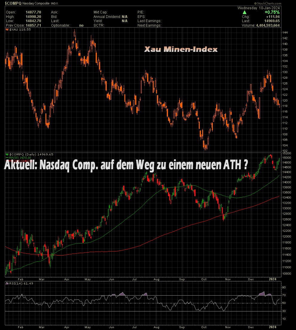 Heute früh wurde diese Formation schon nach oben verlassen. Allerdings sehr zaghaft und ängstlich. Der Anstiegsimpuls dabei mehrfach überschnitten, was immer kein Zeichen für Momentum und Zutrauen ist. Terminlich kein Wunder, die US-Inflationszahlen stehen an. Wenn diese enttäuschen, und die erwartete erste Zinssenkung im März nicht bestätigen, dann geht der Becher kaputt.