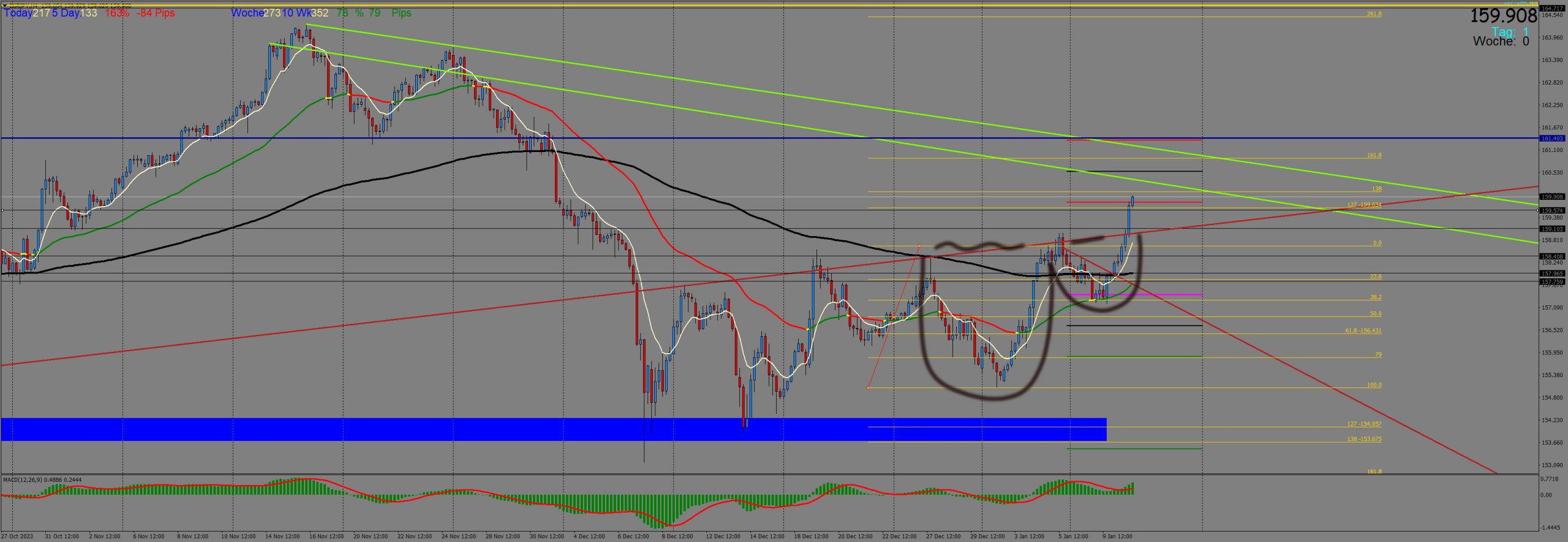 Im Ergebnis hat der EURJPY am Mittwoch den prognostizierte Bereich 159,10 - 159,20 überschritten und das auch kräftig und weit rüber. Damit wurde Plan B aktiviert und die EURJPY-Shorts (immerhin ein halbes Lot von 163 kommend), komplett geschlossen. Sicher war es bis zur letzte Minute nicht. Während der US-Session hat man schon gesehen, wie sehr der Markt gerungen hat. Letztendlich war ein Problem dann doch unüberwindbar - nämlich der YEN.