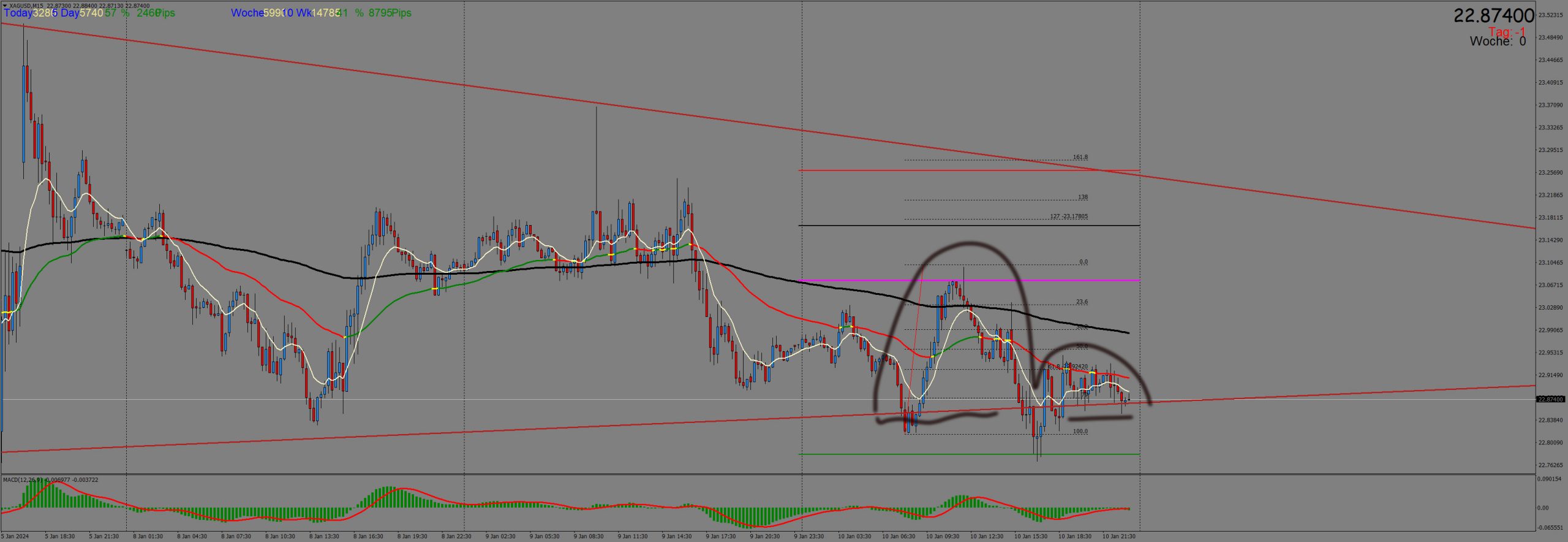 Silber als stets schneller Vorreiter für Abwärts schwächelt schon seit Tagen. Und touchierte eine enorm wichtige letzte Haltelinie zwischen 22,70 und 22,90 bereits 4 bis 5 Mal. Und eigentlich wollte sich Silber Mittwoch schon auf den Weg zu einem ausgewachsenen Wasserfall machen. So wie es auch Platin und Gold anzeigten.