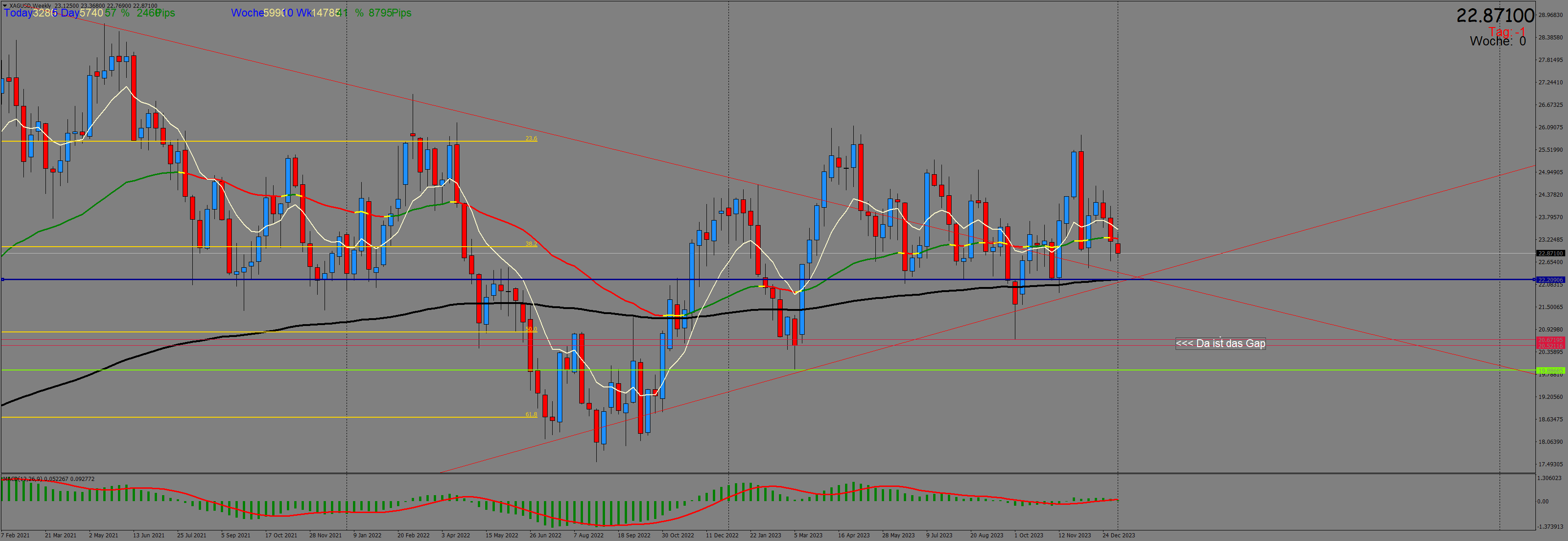 Normalerweise, wenn so ein Fibo-Tool, ein altes Tief unterschreitet, ist der Weg nach unten frei. Üblicher bis zur 161,8 % Extension. Gerade wenn hier auch noch so eine Unterstützungslinie fällt. In den größeren Bildern sieht es beim Silber dann sogar so aus: