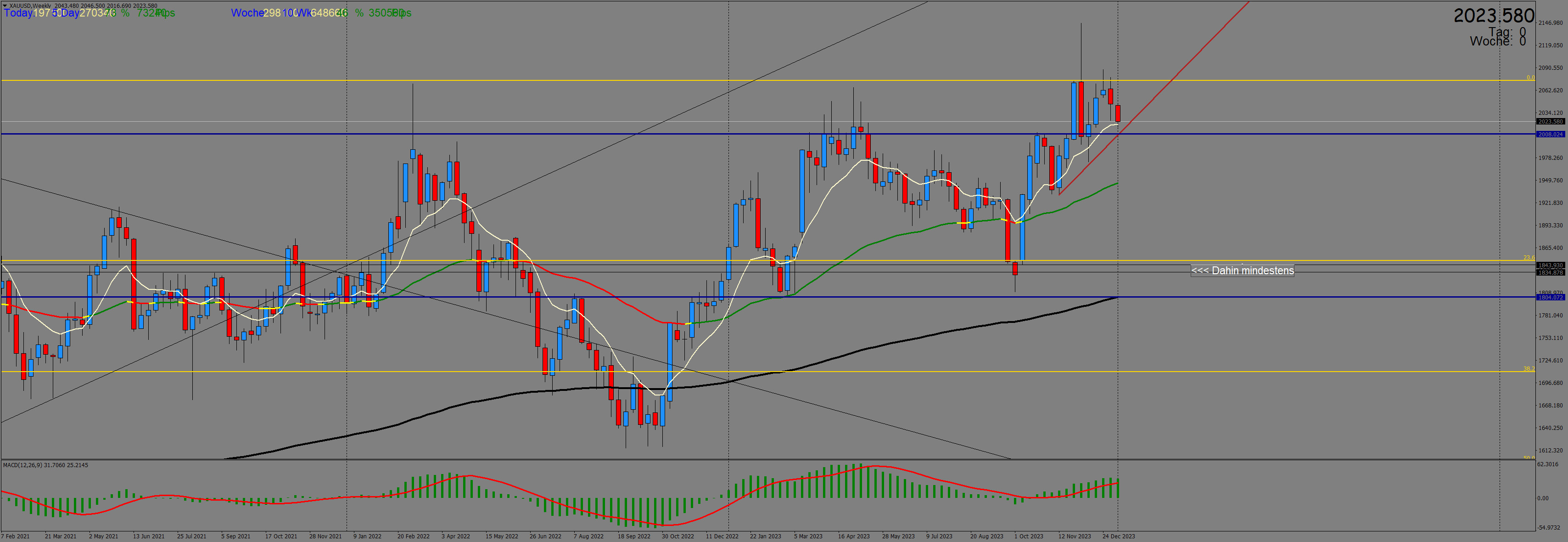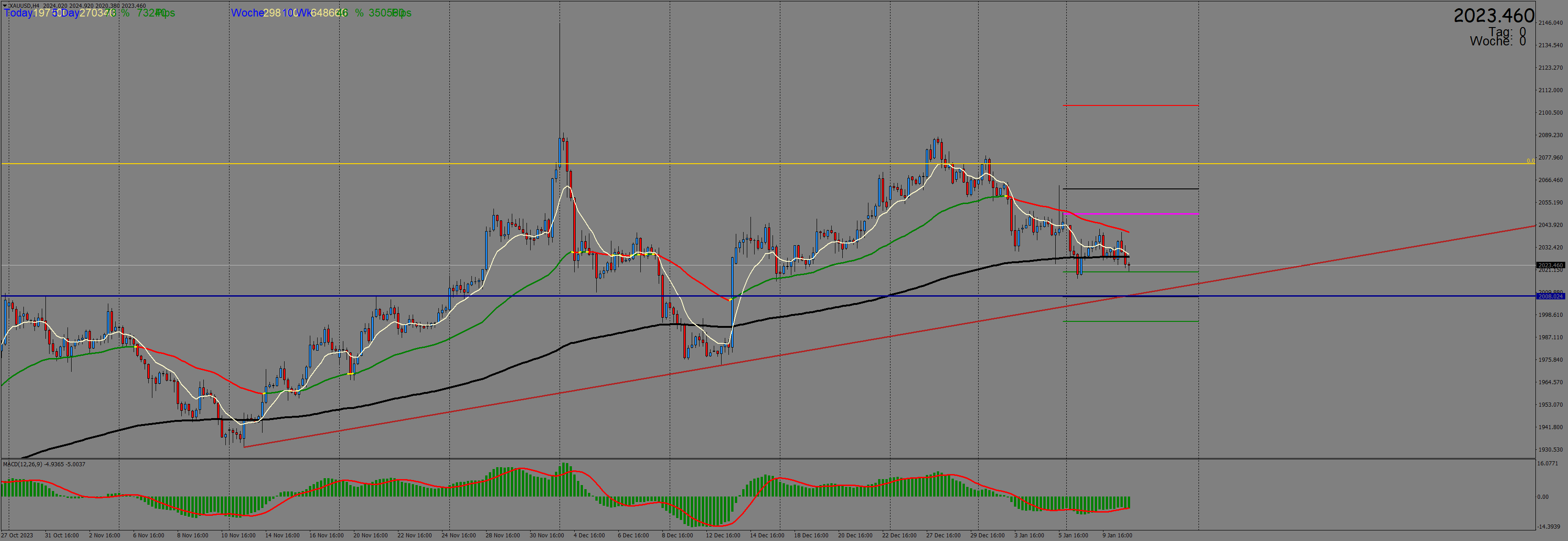Unter 2008,- US$ bekommt der Goldbulle echt ein Problem. Die Obergrenze zum potentiellen Luftholen lagert so bei 2042 - 2043 US$. Aber auch hier gilt, eher unwahrscheinlich, 2035,- ist mittlerweile ein guter Widerstand.