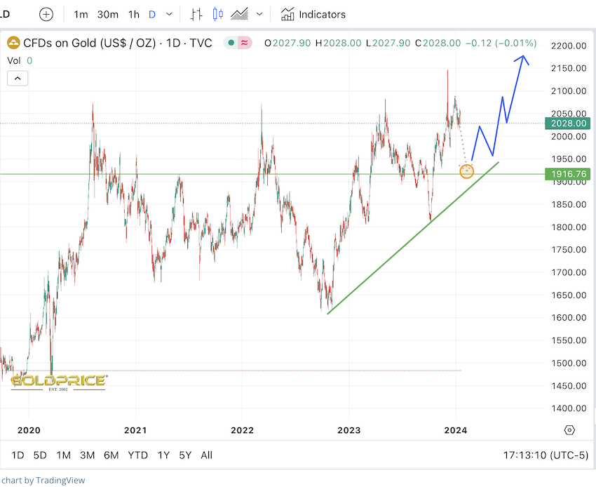 Der Gold in USD Tageschart, mit zwei ganz bestimmten Linien.